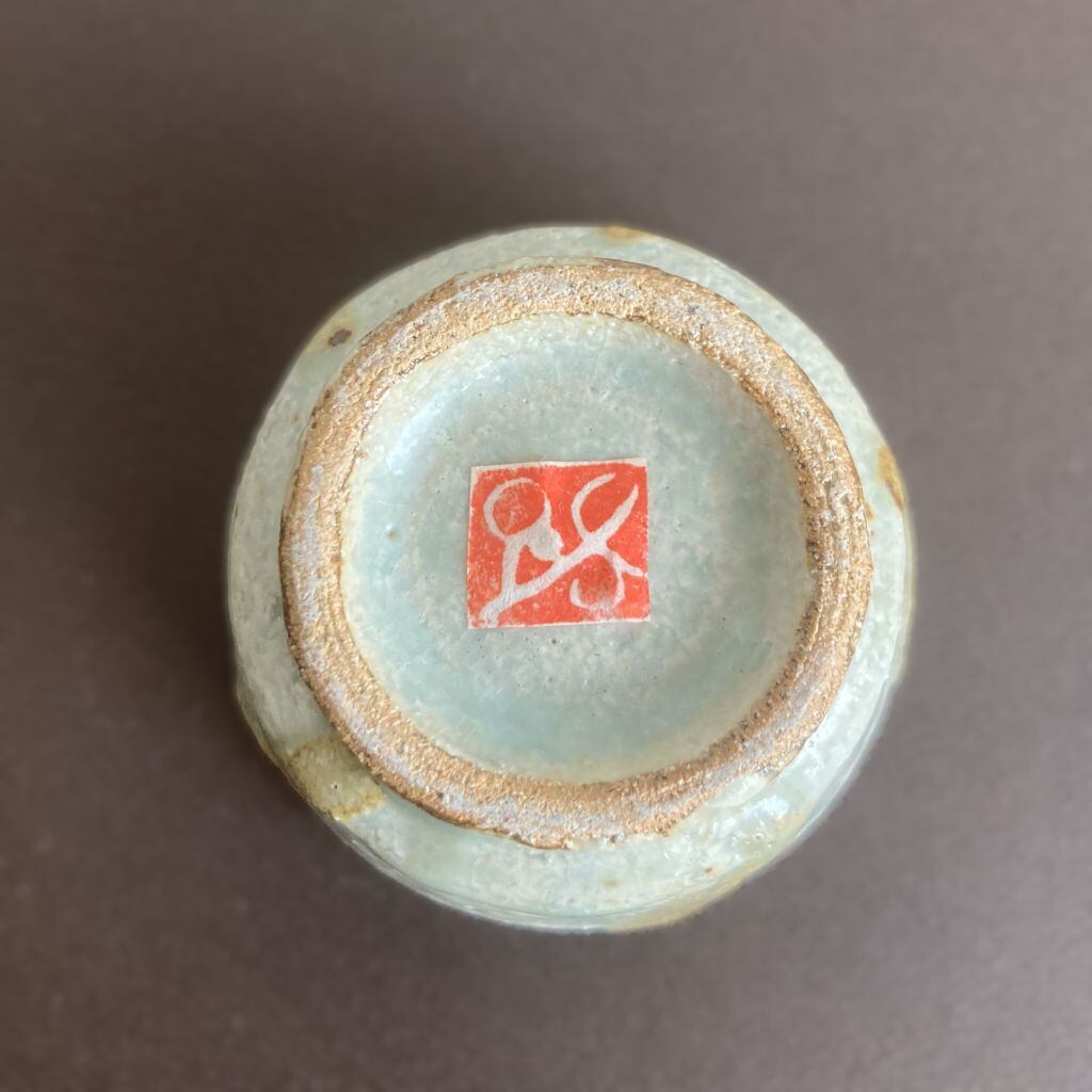 高台や高台内にも淡い緑の釉薬に包まれた統一感ある陶器の表面には、立体感と深みのある斜めのラインがいく筋も施され、どの角度から見ても魅力的な輝きを放ちます。ぐるっと入った一本一本表情の違うラインは、飽きのこない楽しさをもたらし、使用する際の手元に心地よい安定感を感じさせてくれます。