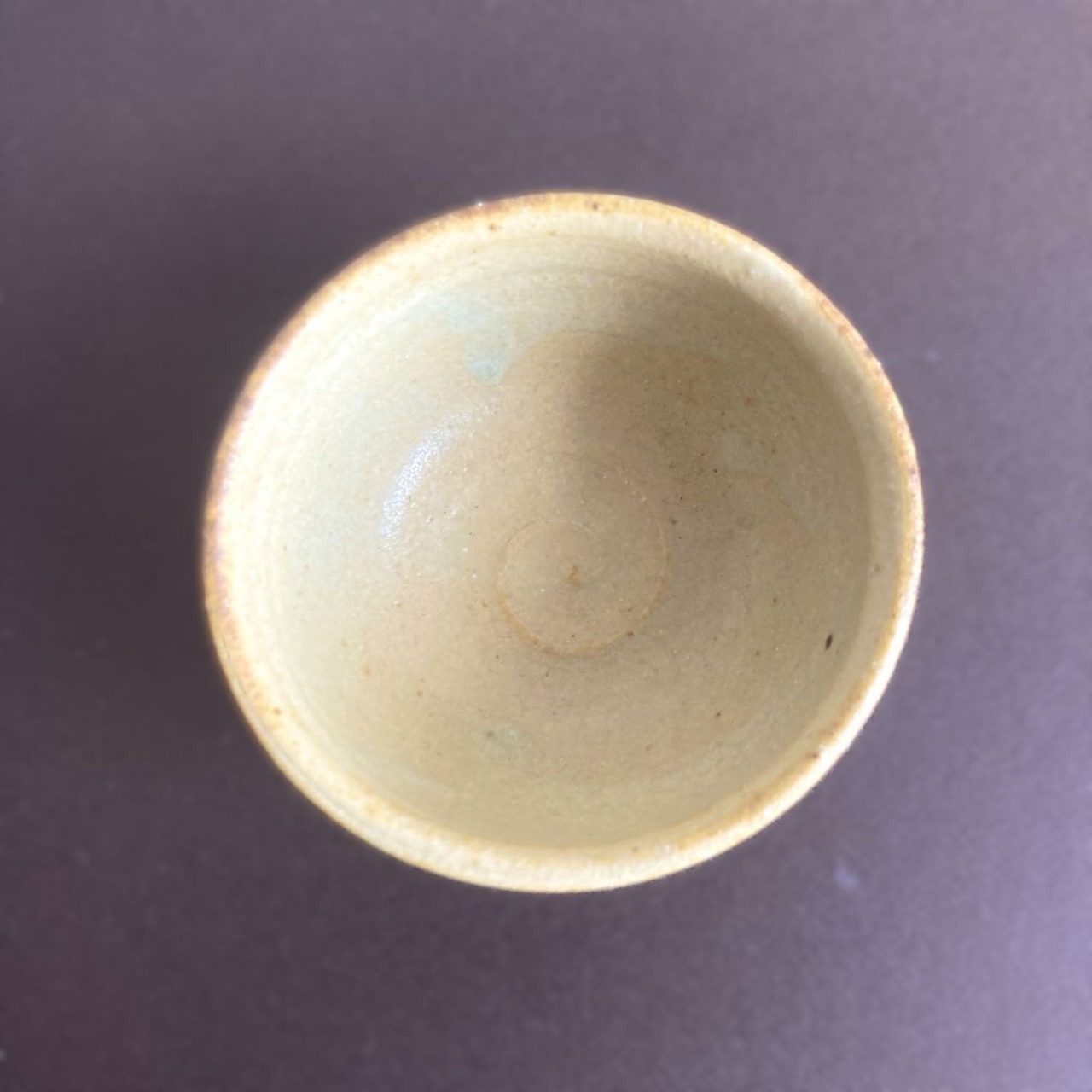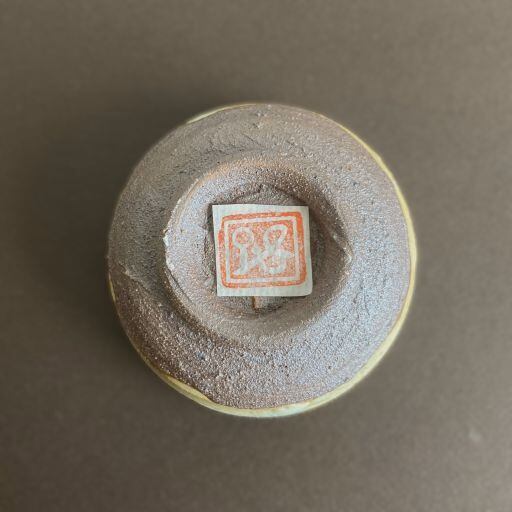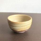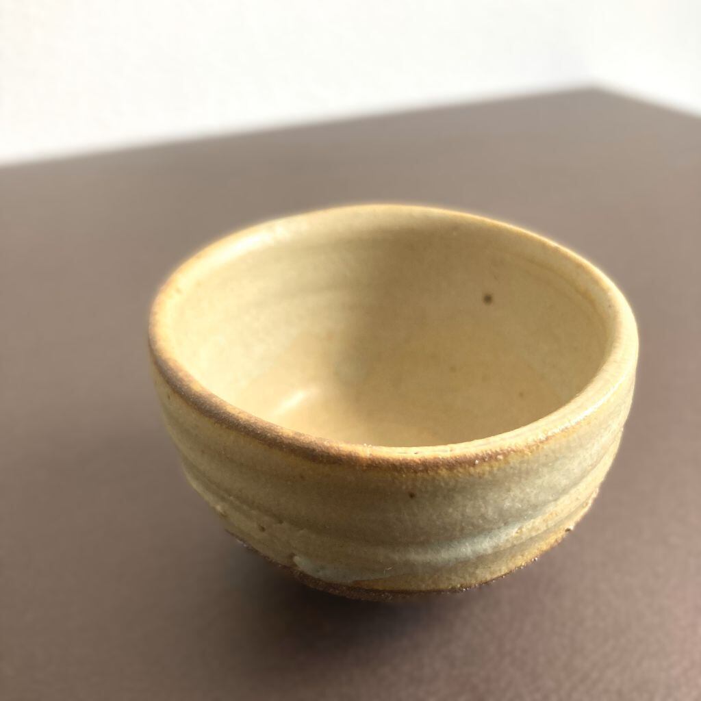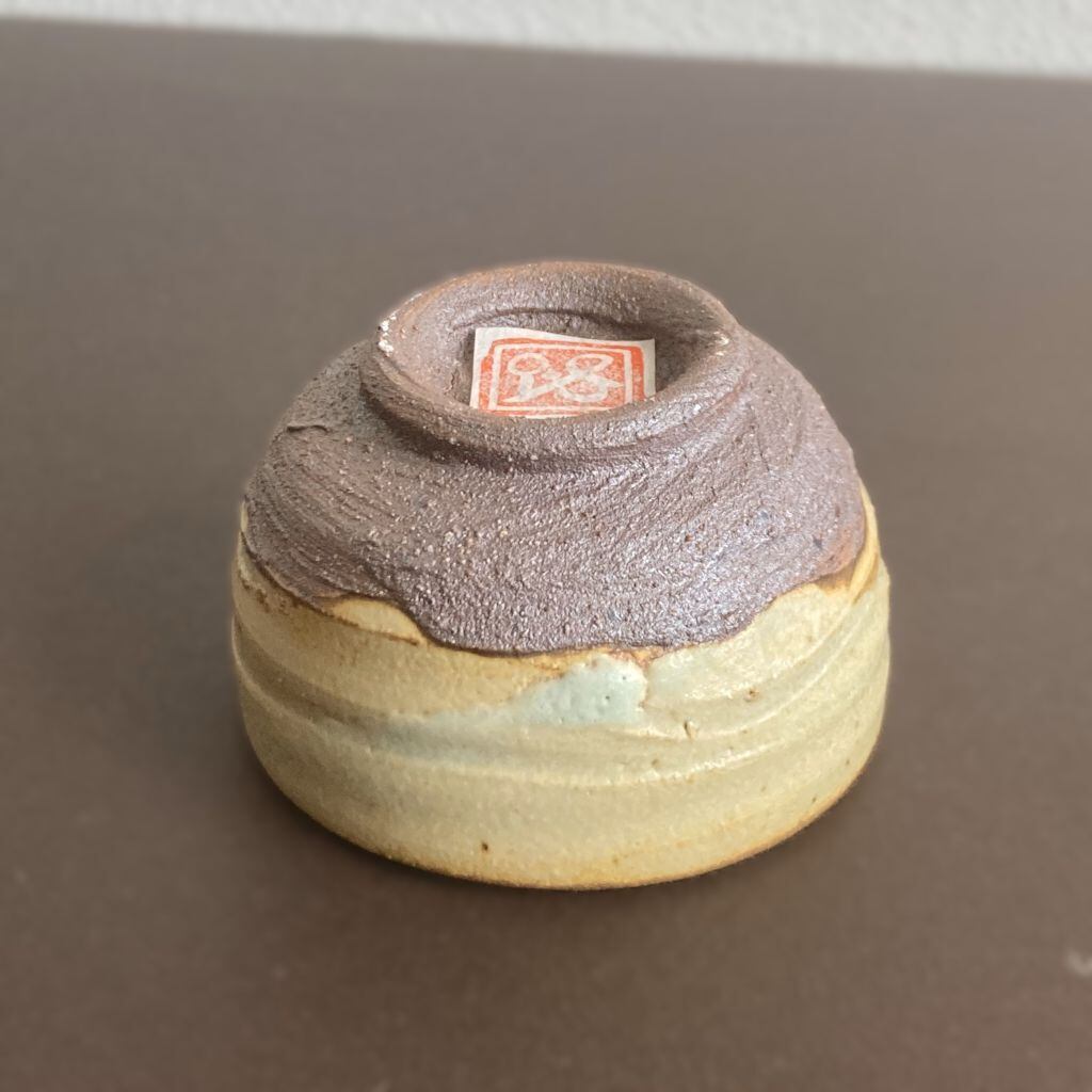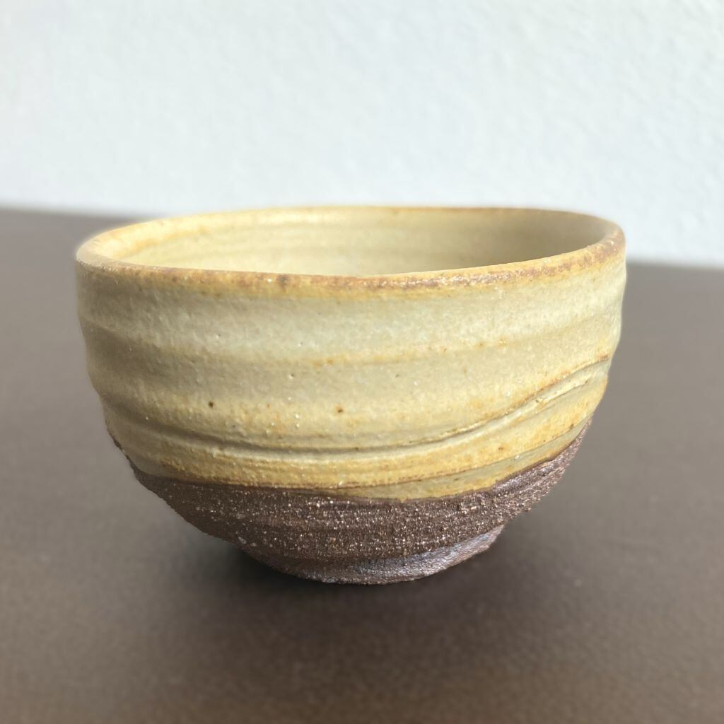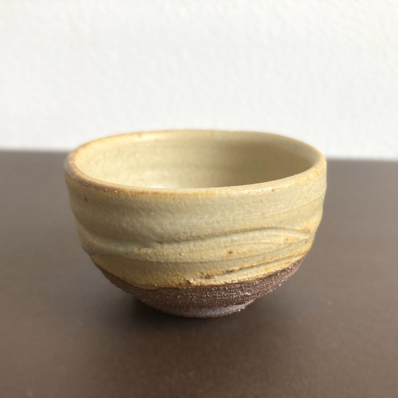 上半分までかけられた釉薬の中に、横に一本すっとゆらぎのある筋模様が流れるように入っています。その下には濃茶のマットな土が、そのまま高台に続いていきます。
