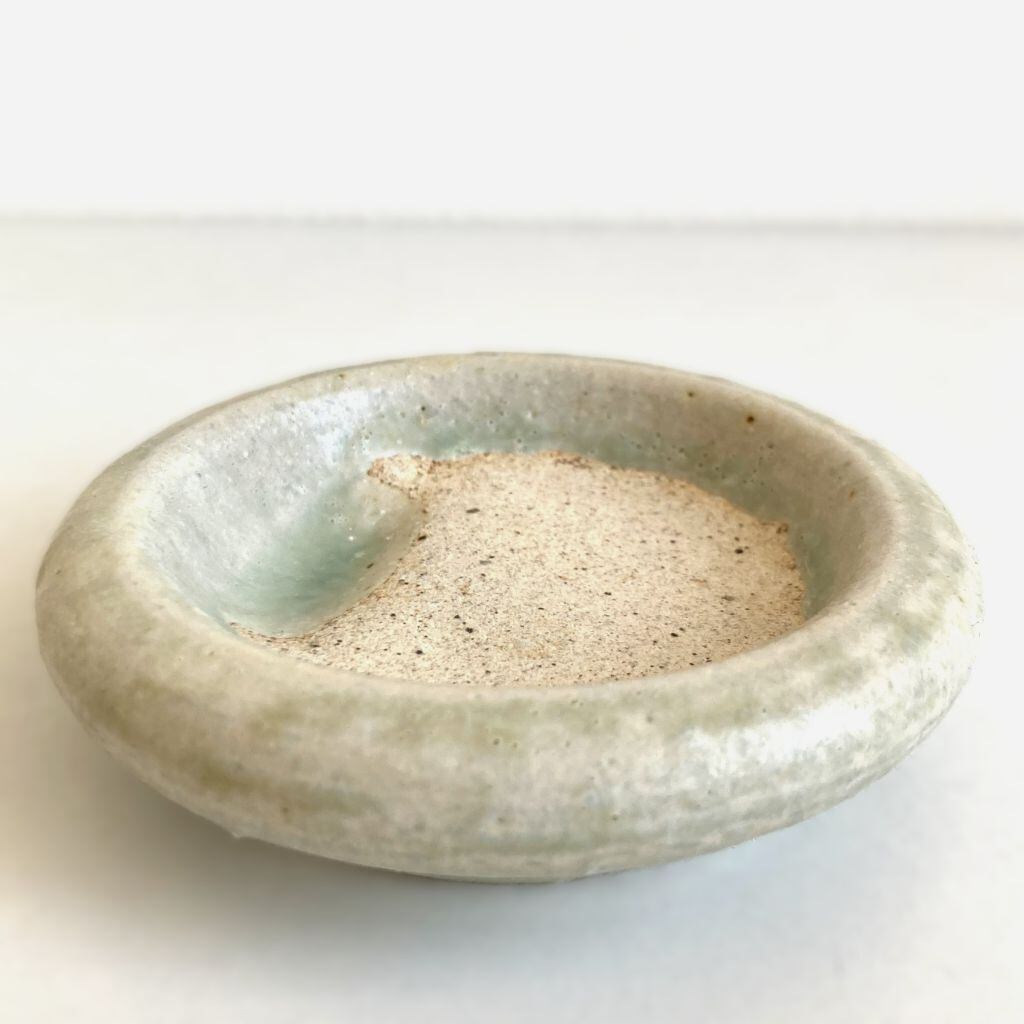 手のひらサイズの、簡単に持ち運べるこの陶硯は、気持ちのいい滑らかな陶器の質感と、まん丸いフォルムが愛らしさを引き立てています。