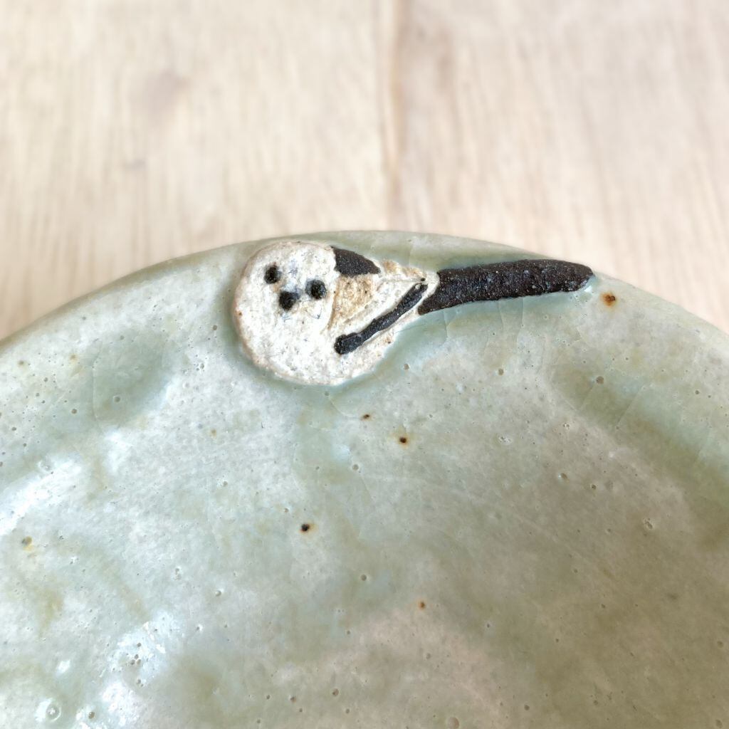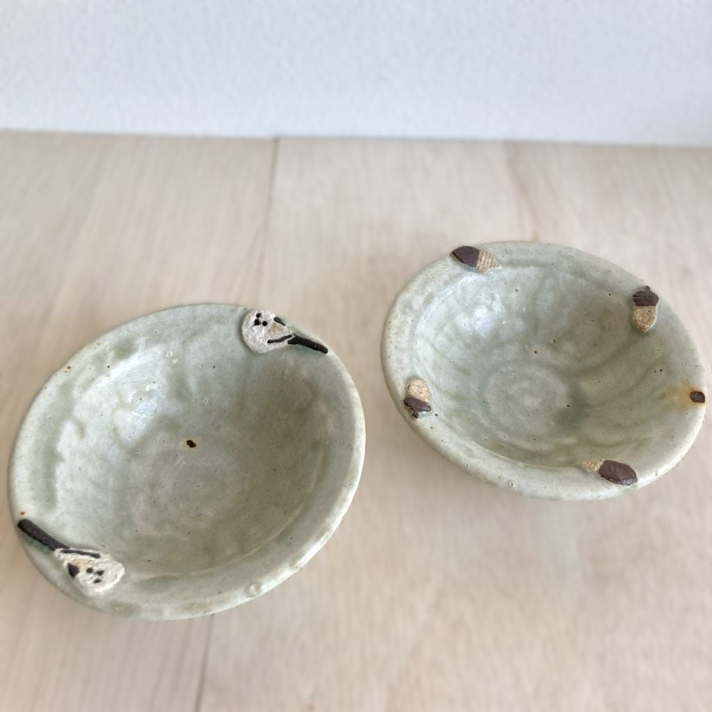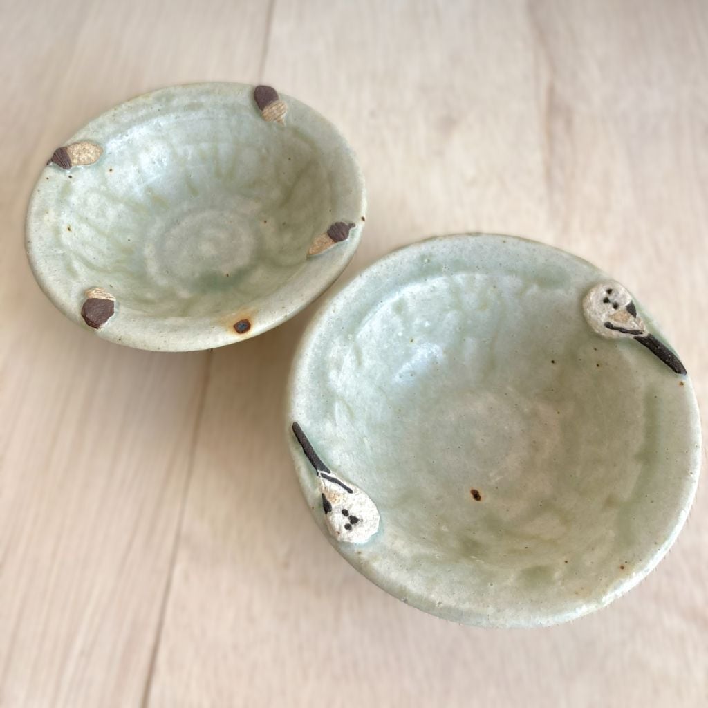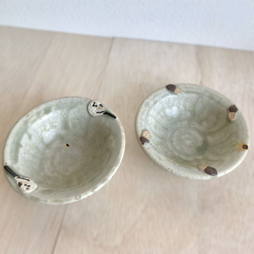 この小鉢は、可愛らしいシマエナガとどんぐりをモチーフにした、心温まるデザインが特徴です。つぶらな瞳の2羽のシマエナガがちょこんと佇む姿と、色の違う4個のどんぐりの形が可愛らしい小鉢です。