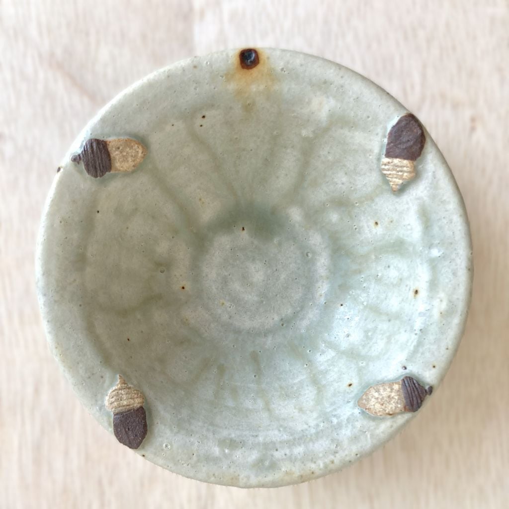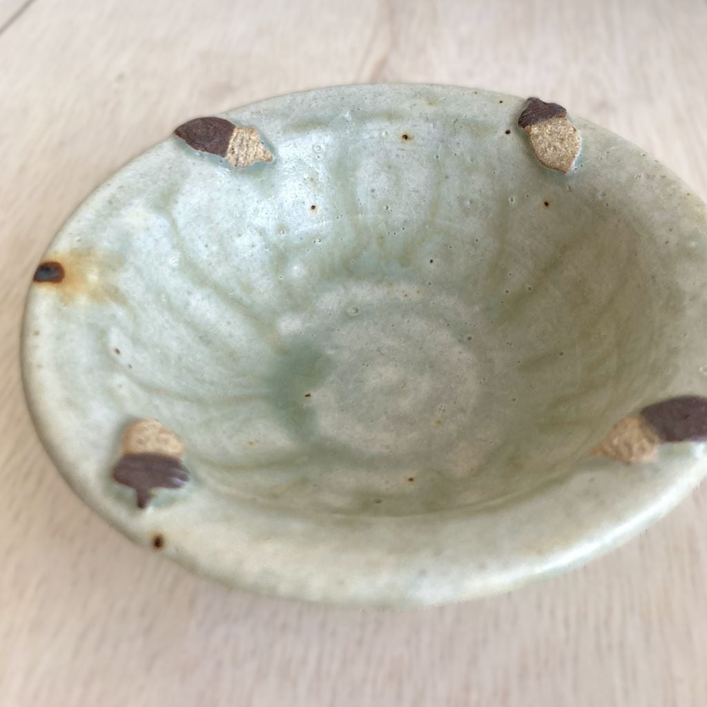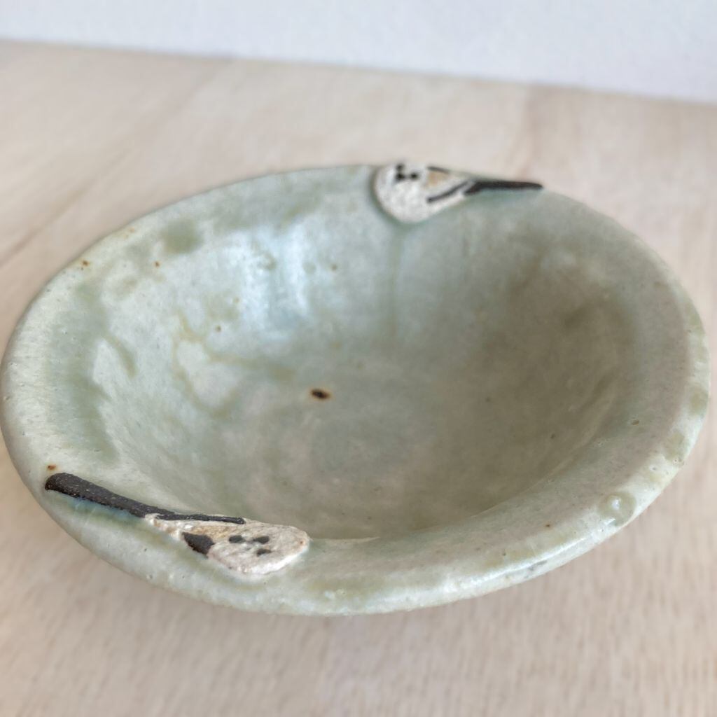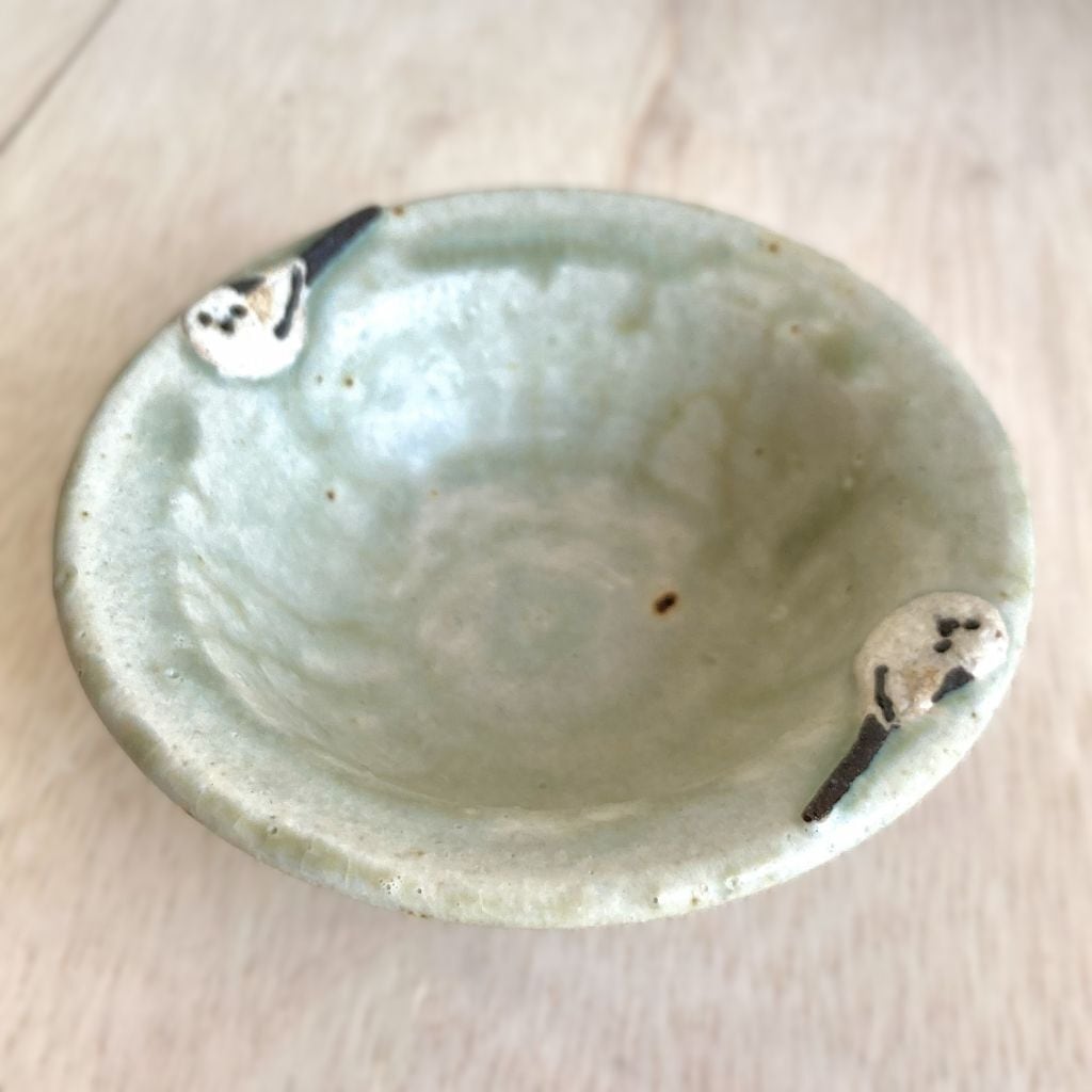 この小鉢は、可愛らしいシマエナガとどんぐりをモチーフにした、心温まるデザインが特徴です。つぶらな瞳の2羽のシマエナガがちょこんと佇む姿と、色の違う4個のどんぐりの形が可愛らしい小鉢です。
