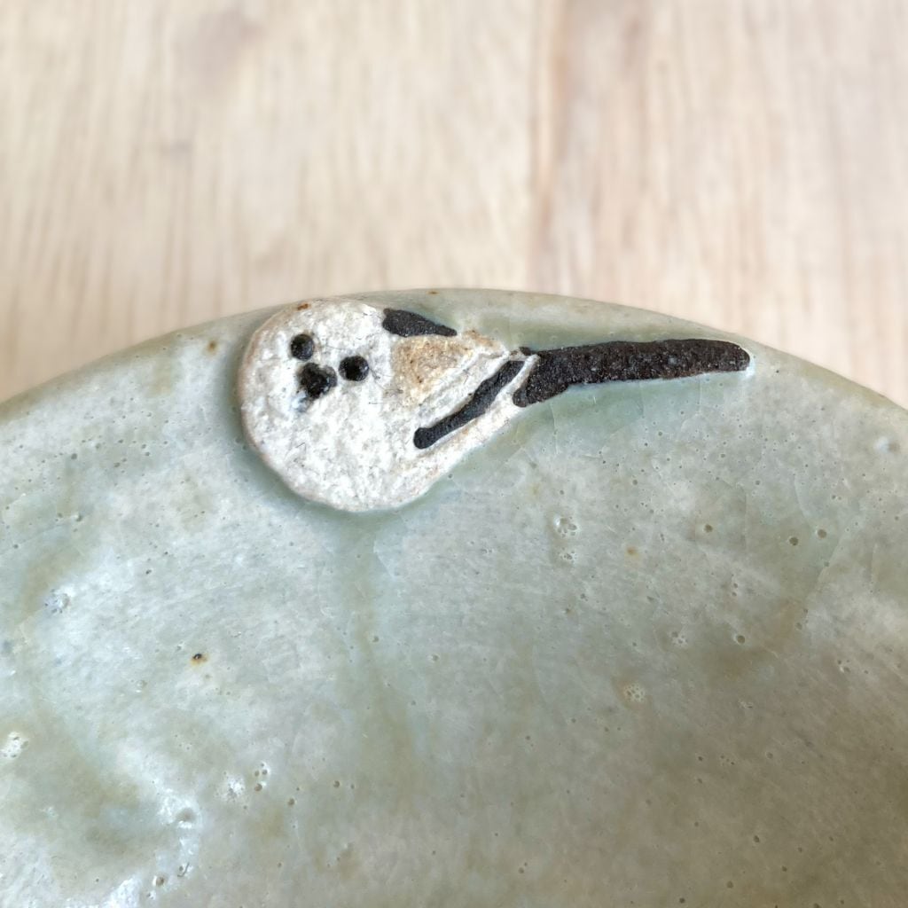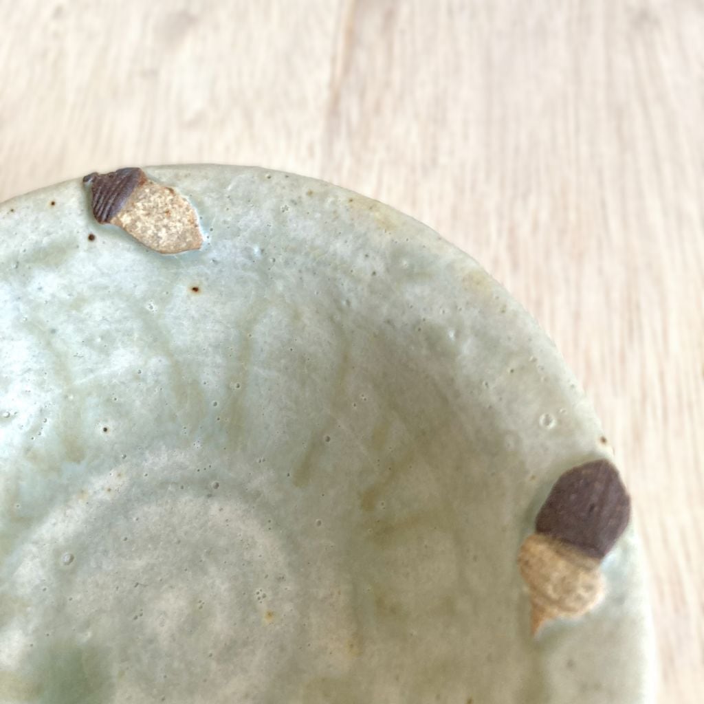 シマエナガとどんぐりは、釉薬をかけた上から、採食した土を貼り付けているため、立体的で土そのもののざらっとした質感に仕上がっています。