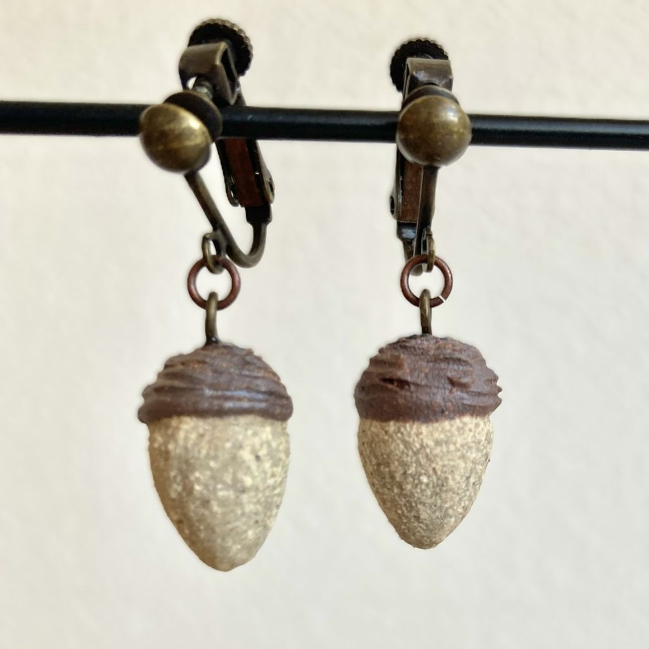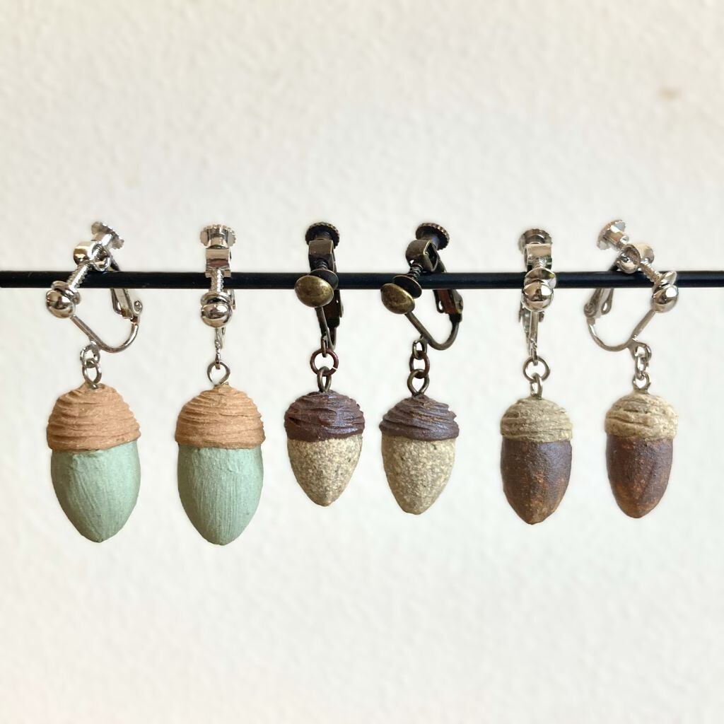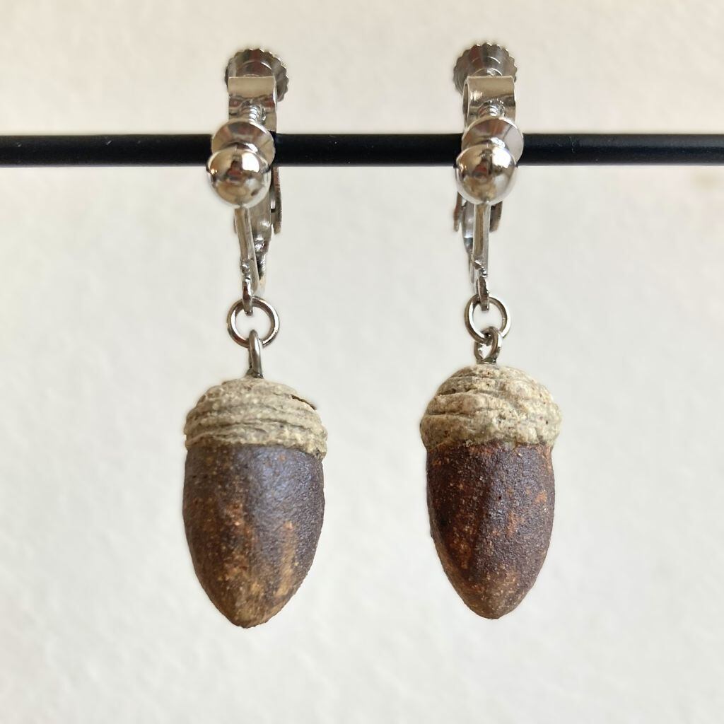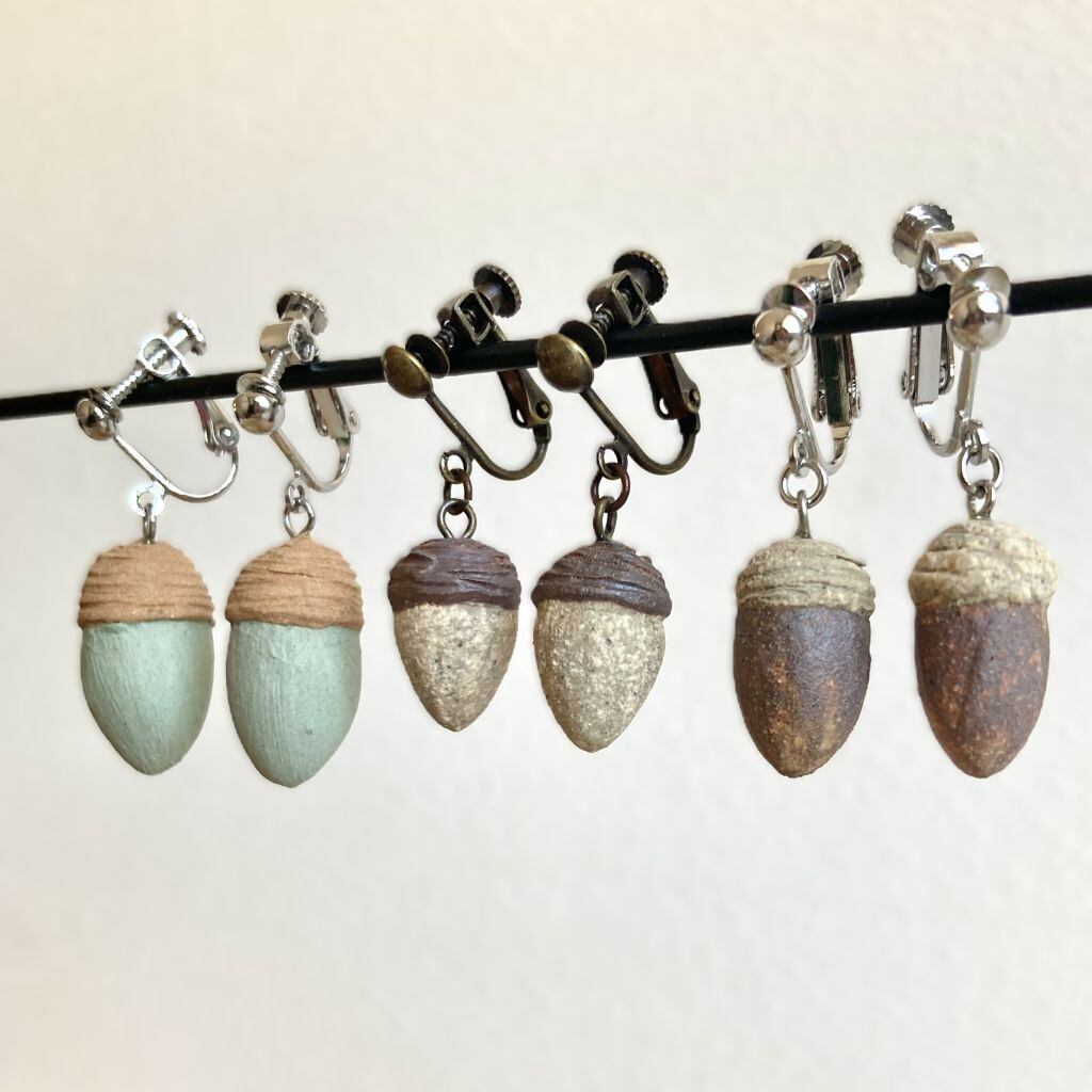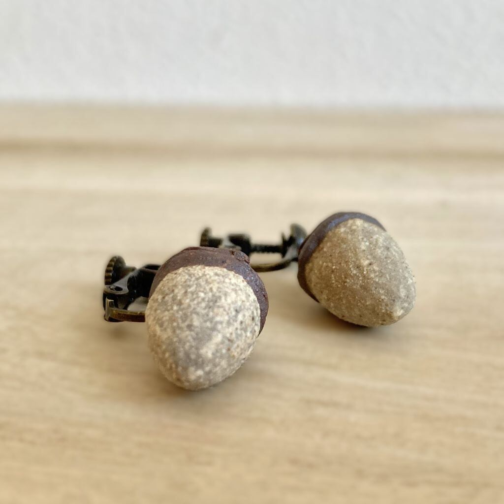 土に混ぜる鉄などの成分の量を調節することで、微妙な色の違いを出したどんぐり型のイヤリングです。