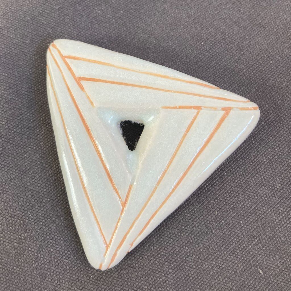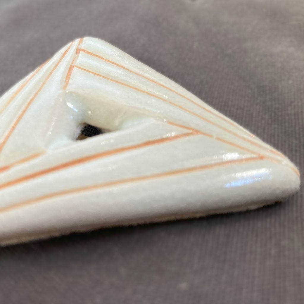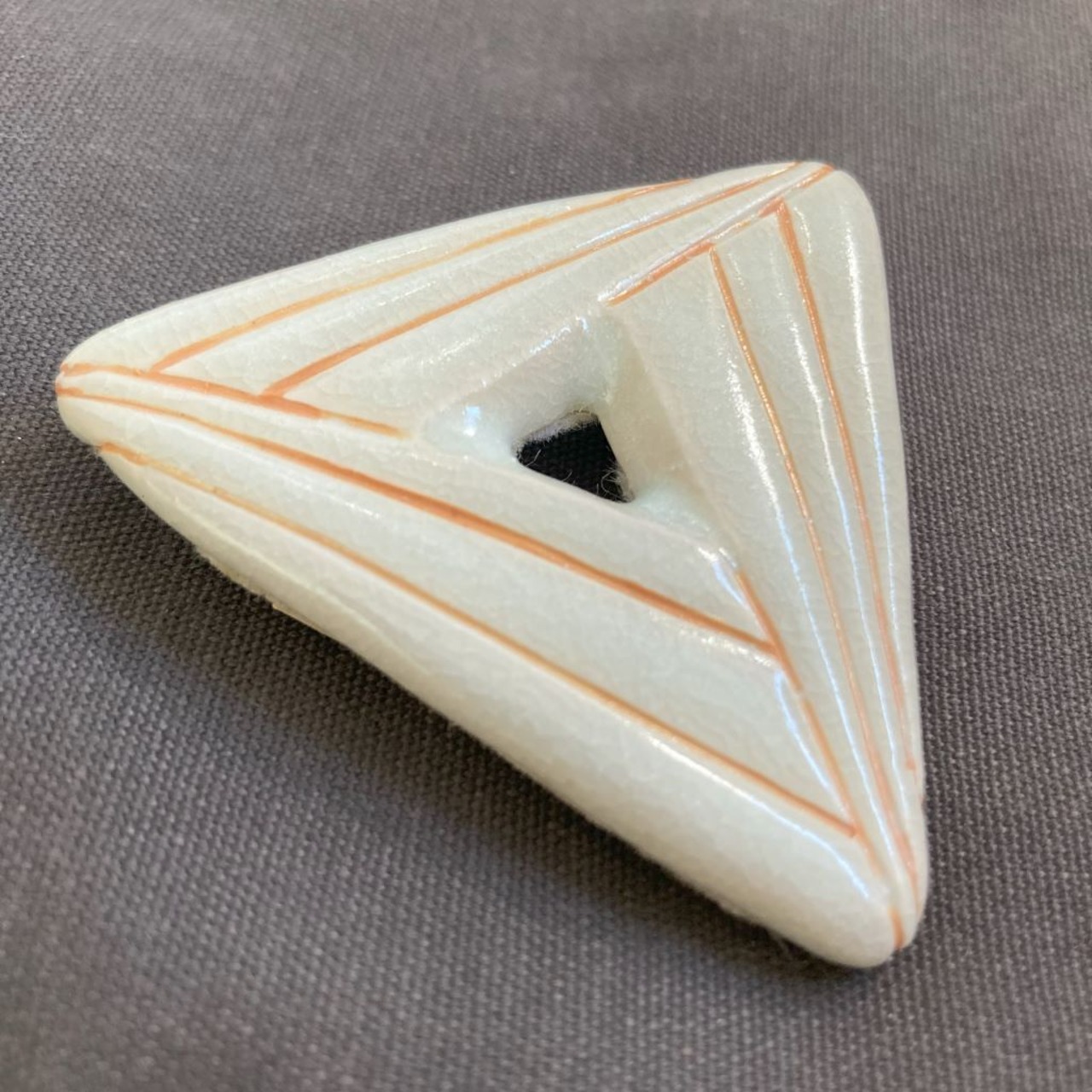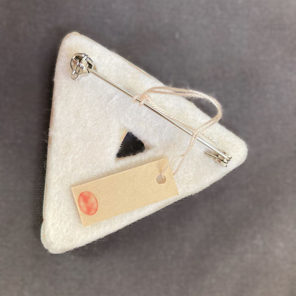 光沢のある美しい仕上げが特徴的な三角のブローチです。三角のそれぞれの辺に沿うように引かれた土のオレンジ色の直線が、ツヤのある柔らかな白と相まって、シンプルながらも幾何学的で万物的な印象を与えてくれます。