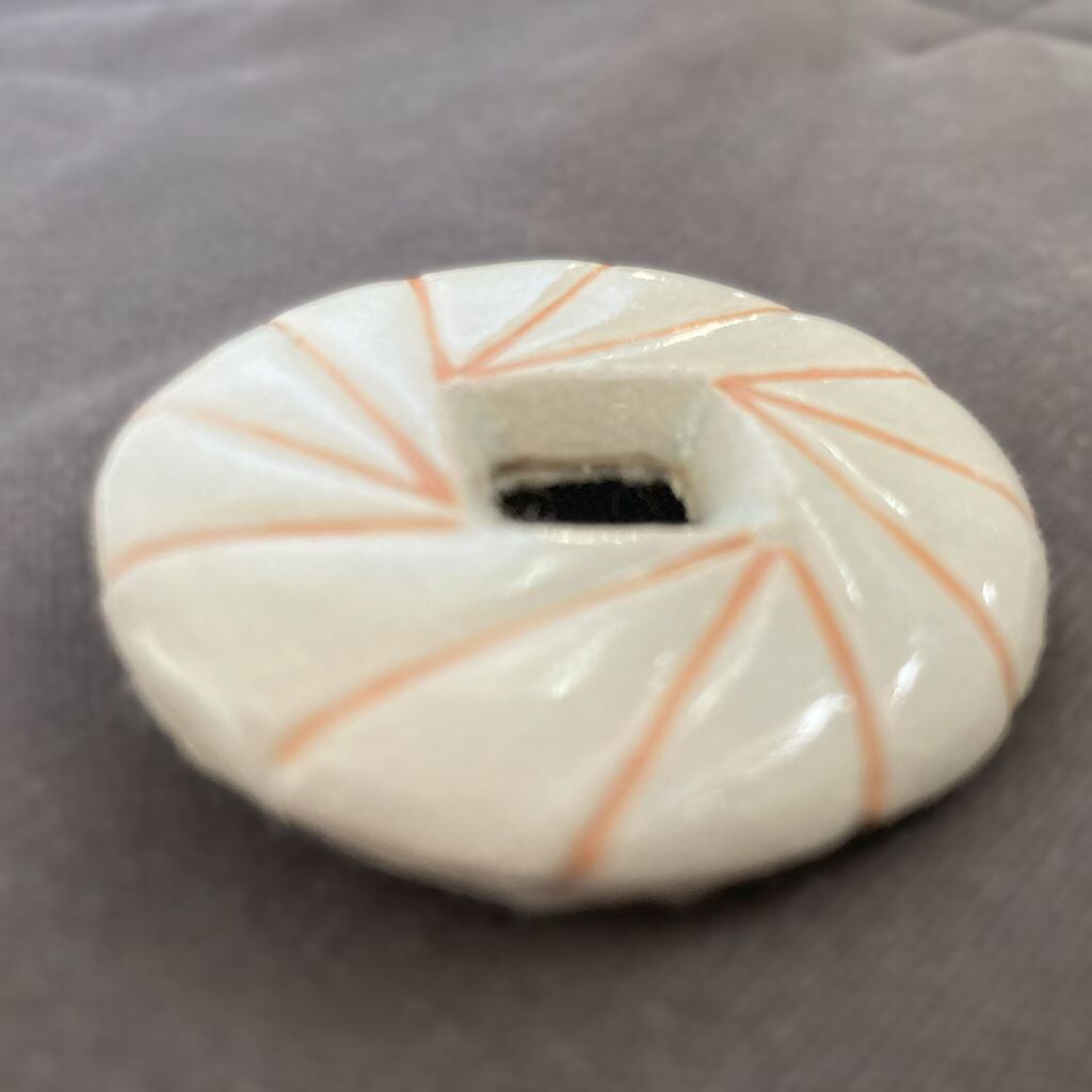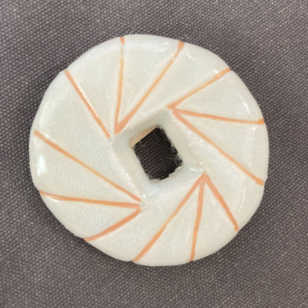 光沢のある美しい仕上げが特徴的な丸いプローチです。丸の中の四角から放たれる土のオレンジ色の直線は、ツヤのある柔らかな白の中心から始まり、まるで風が吹き込んで来るかのような印象を与えてくれます。手のひらにしっくりと収まる形とシンプルな色合いでありながら、個性的な装いにも彩りを添えてくれます。日常の毎日や特別なシーンに、アイデア次第で幅広くお楽しみください。