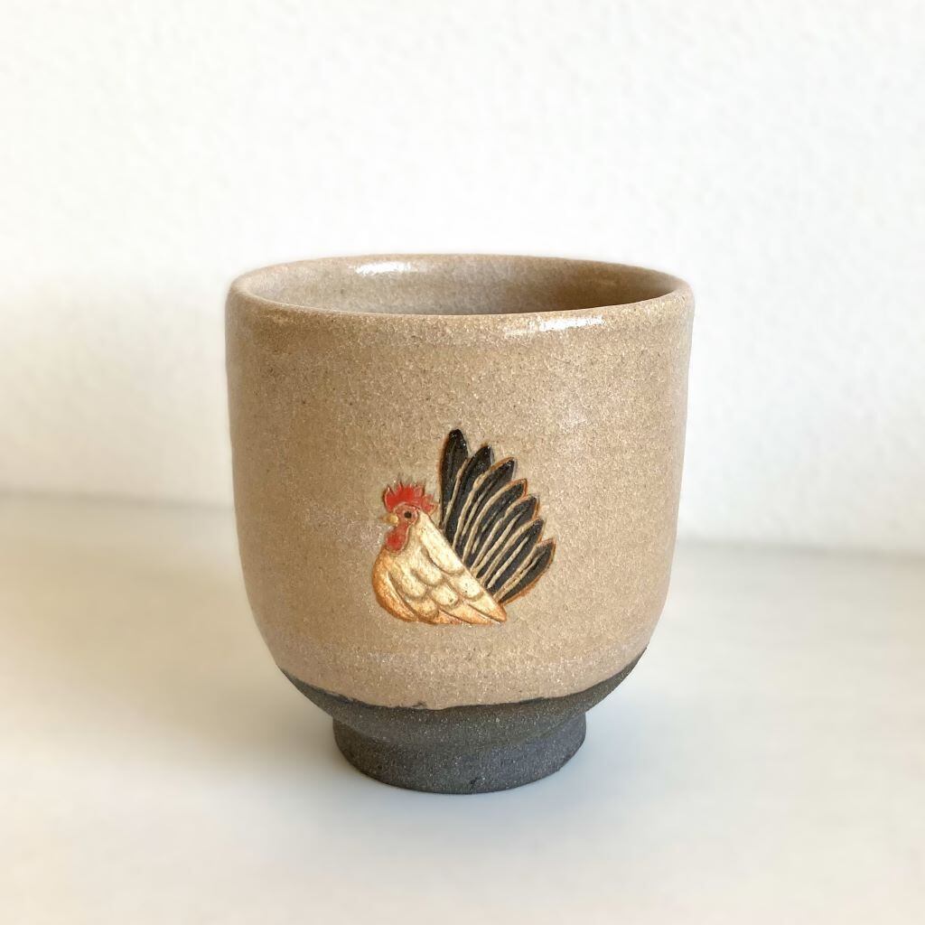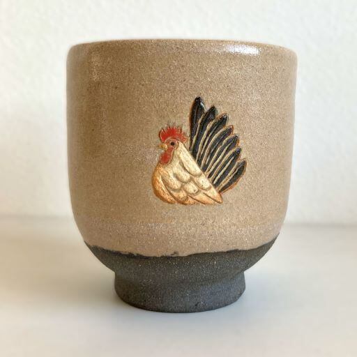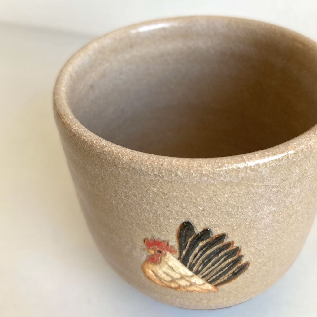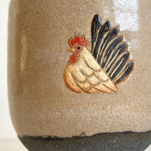 表面には尾羽が堂々としたおんどりが鎮座し、裏面には「酉」の字が施されています。色をつけた土を貼り付け細かく模様をつける事で、独特の立体感を出しています。見るたびに心が和むデザインです。