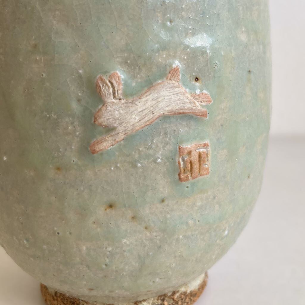表面には愛らしい白うさぎが飛んでいる様子が描かれ、裏面には「卯」の字と白うさぎが施されています。上から土を貼り付け繊細な模様を施すことで、立体感と温かみのある仕上がりを実現しています。見るたびに癒されるようなデザインです。