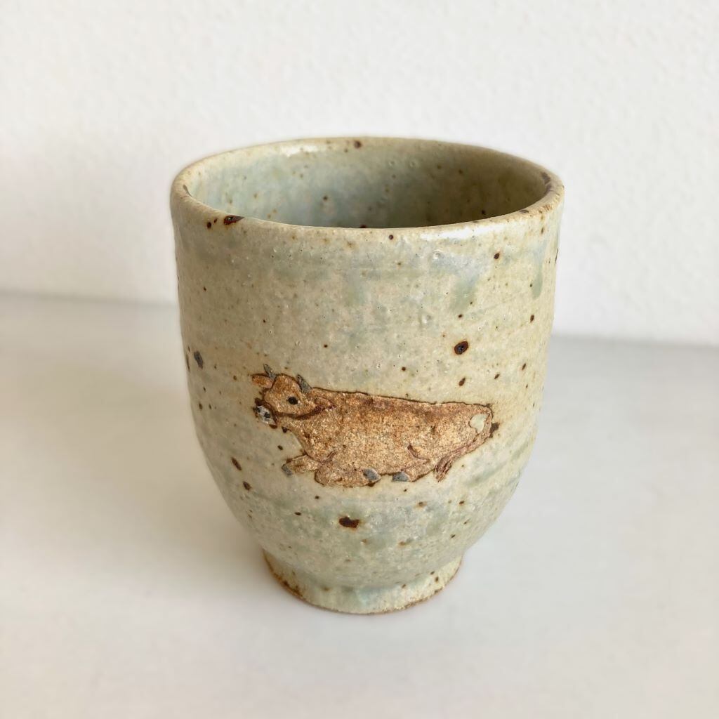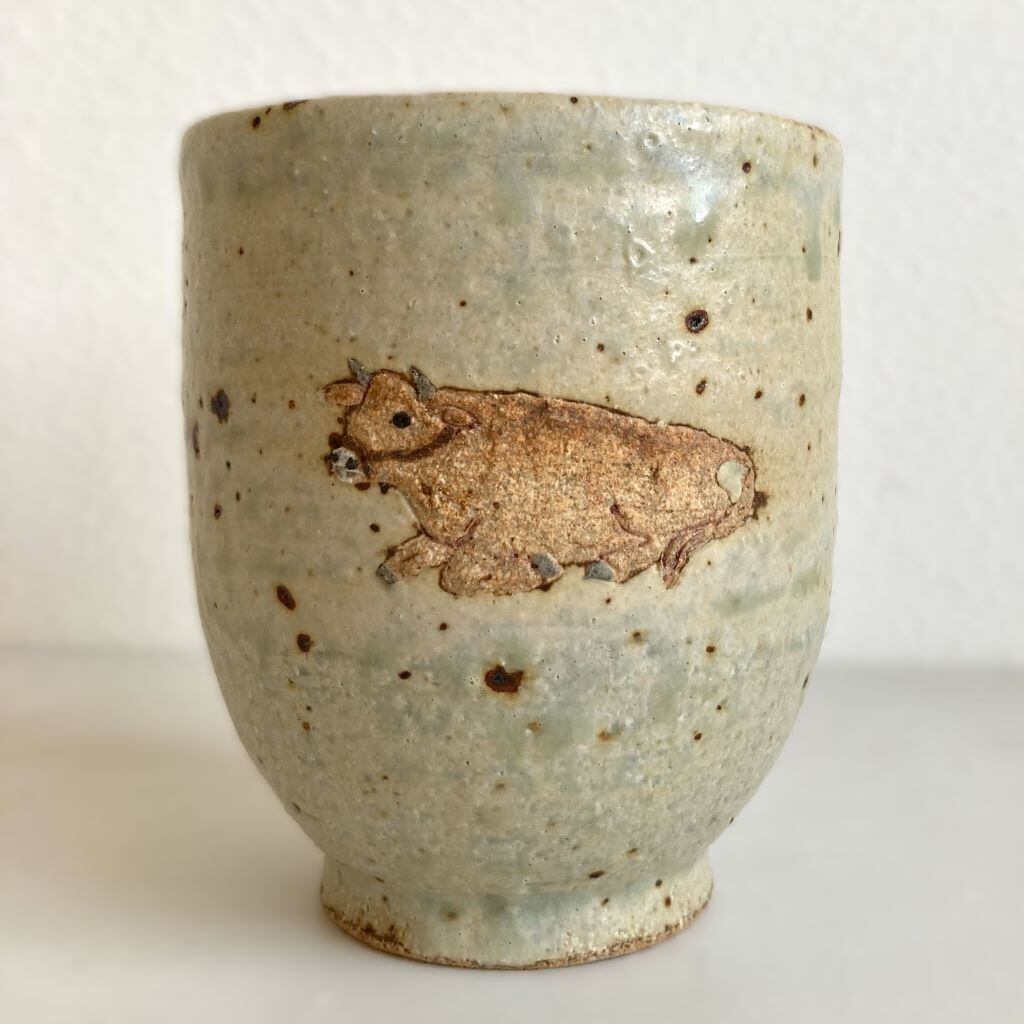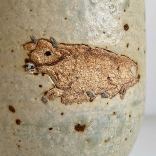 表面には温かみのある赤毛の牛が休んでいる姿が描かれ、裏面には「丑」の字のモチーフが施されています。背中からグラデーションのできるよう土を貼り付けて、細かく丁寧に模様をつけ、立体感と温もりが現れています。