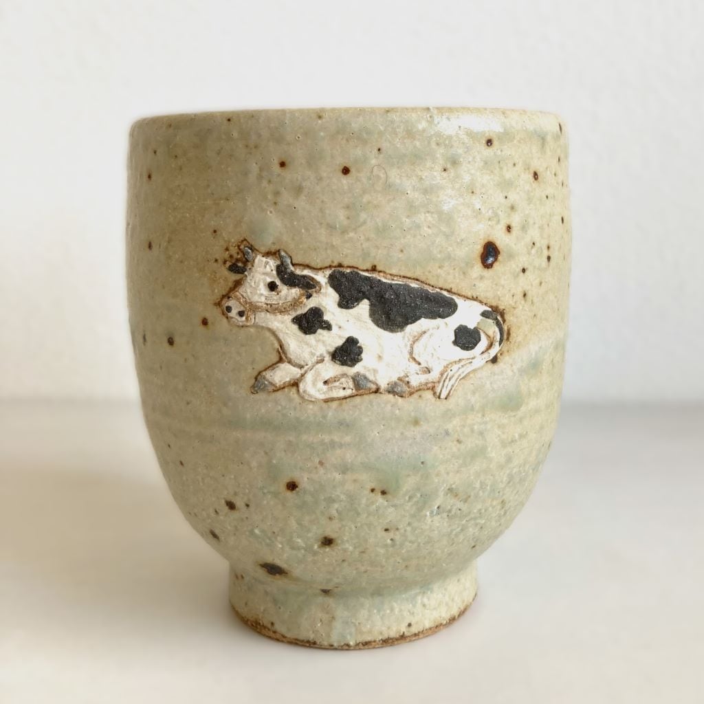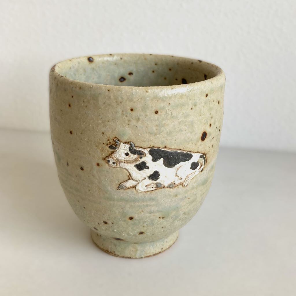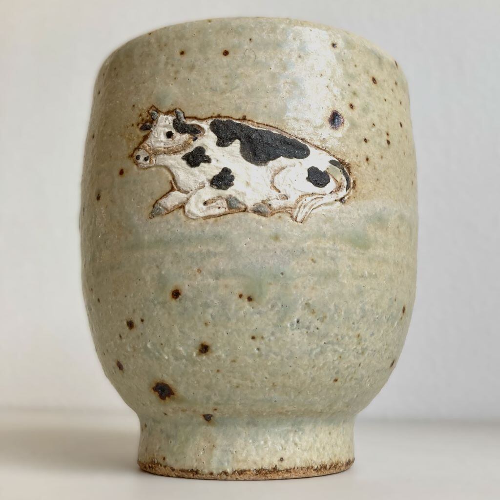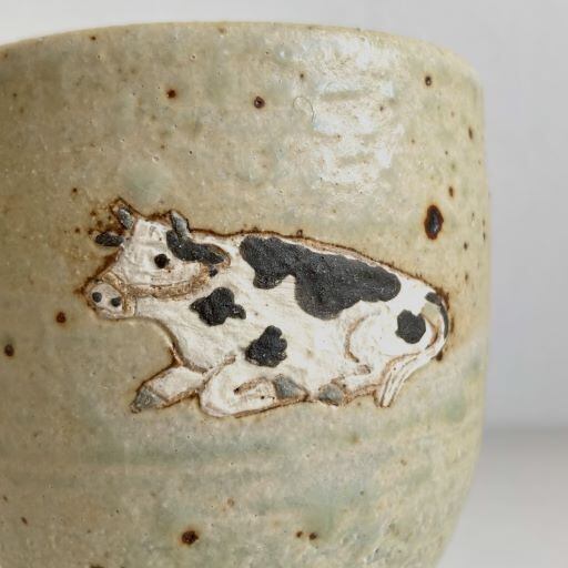 表面には温もりのある乳牛が穏やかな表情で佇んでおり、裏面には「丑」の字のモチーフが施されています。色の違う土を張り付け、丁寧に繊細な模様を描いて立体感を出しています。見るたびに心が温まるデザインです。