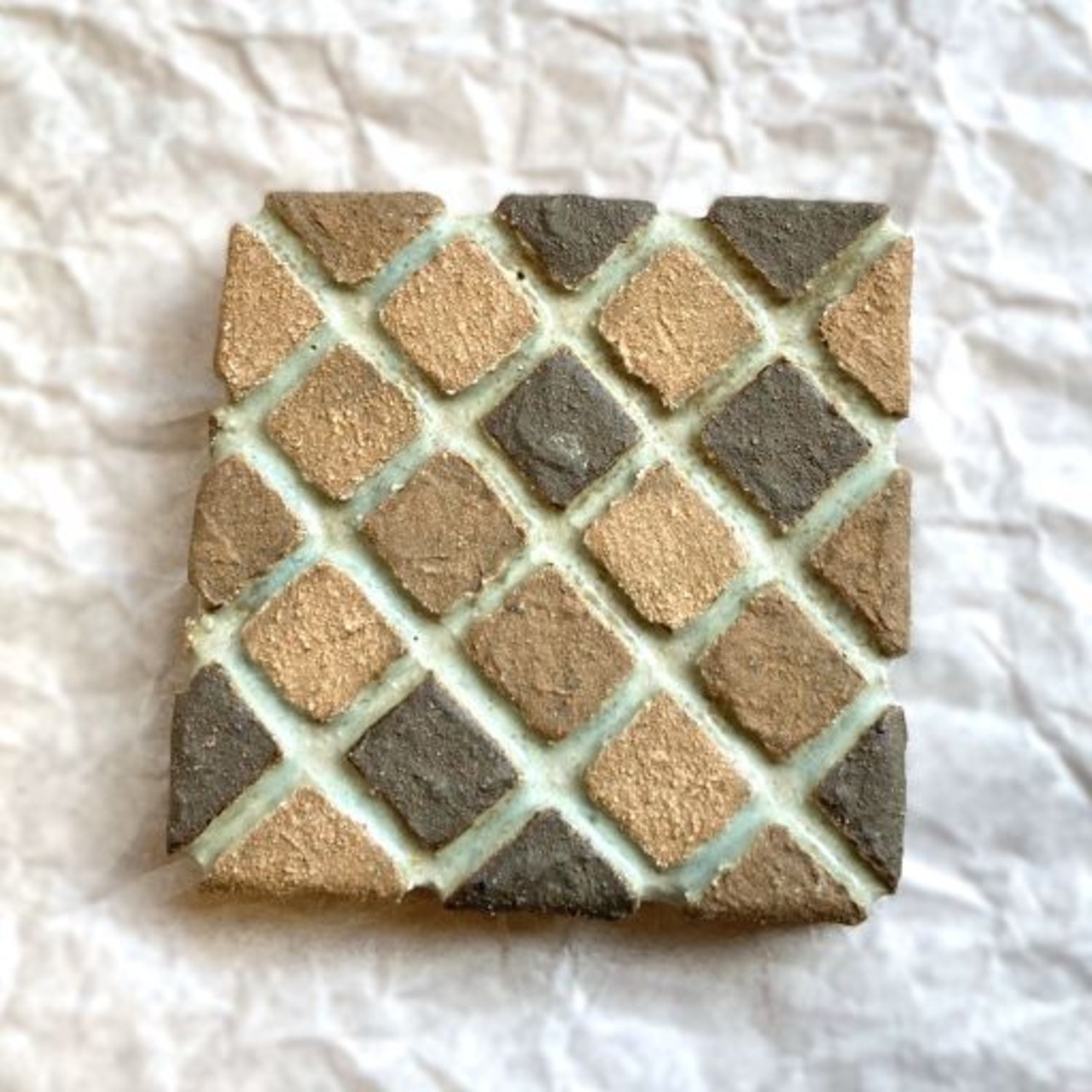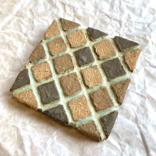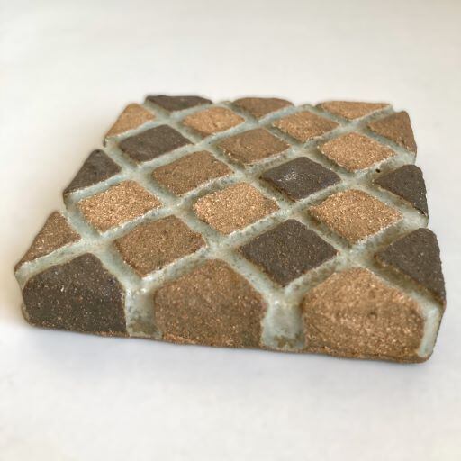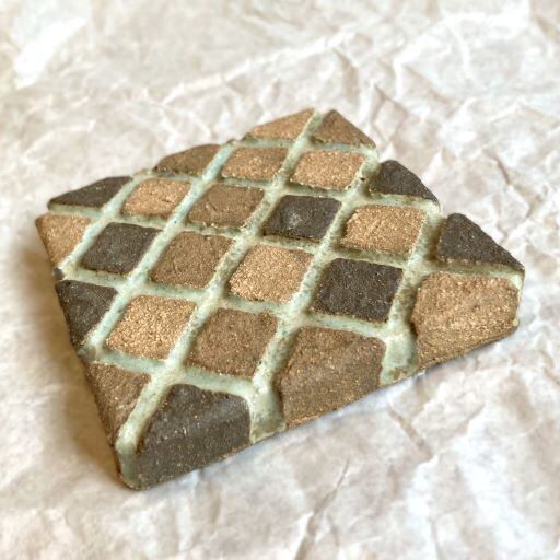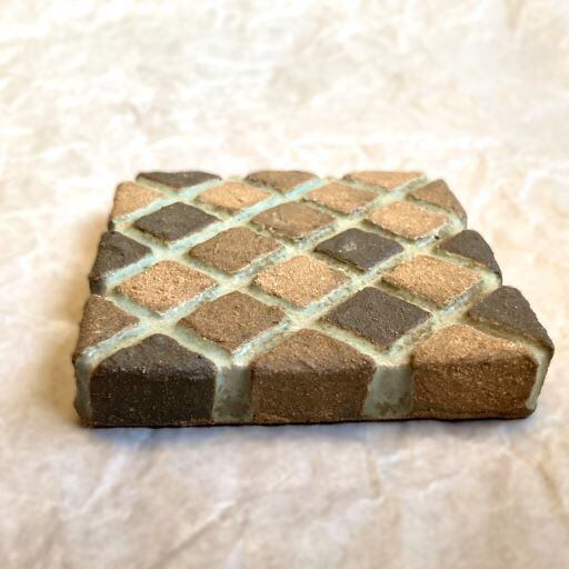 タイルのようなデザインが施されたこの文鎮は、シンプルながらも遊び心を感じられらる作品です。まるでレンガのような色の異なる土が組み合わさっていて、見ているだけで楽しませてくれます。ざらっとしたマットな質感と落ち着いた色調が、デスクや書斎に温もりを加え、書類や本をしっかりとホールドしてくれる力強い味方です。