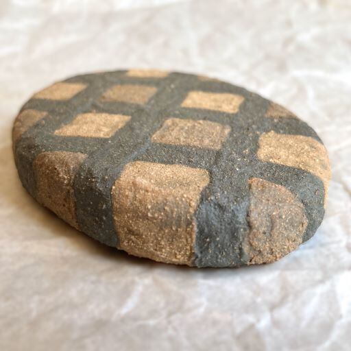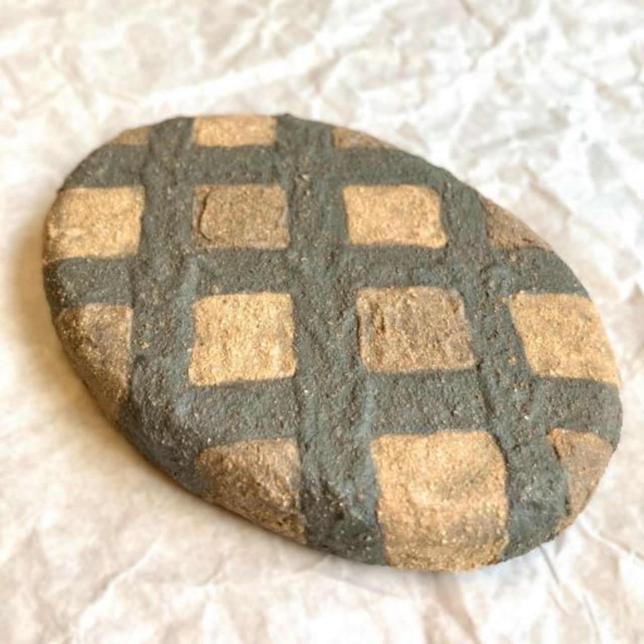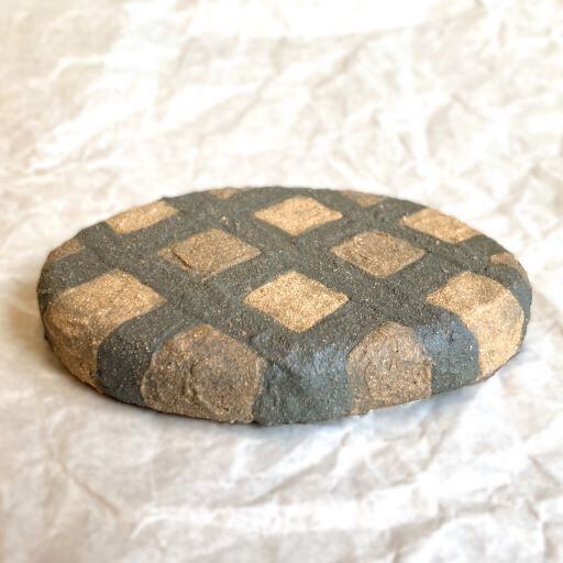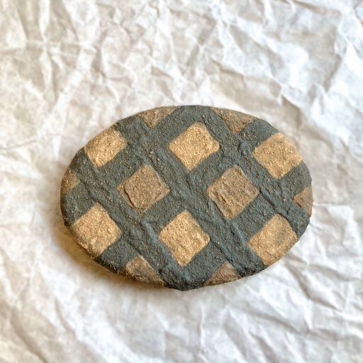 美しい格子模様が施されたこの楕円の文鎮です。色の異なる土が巧みに組み合わさり、独特の存在感を放っています。まるで美味しそうに焼けたハンバーグのような…。