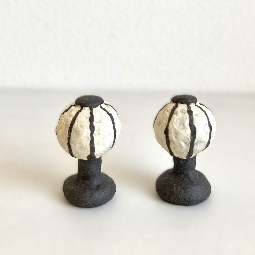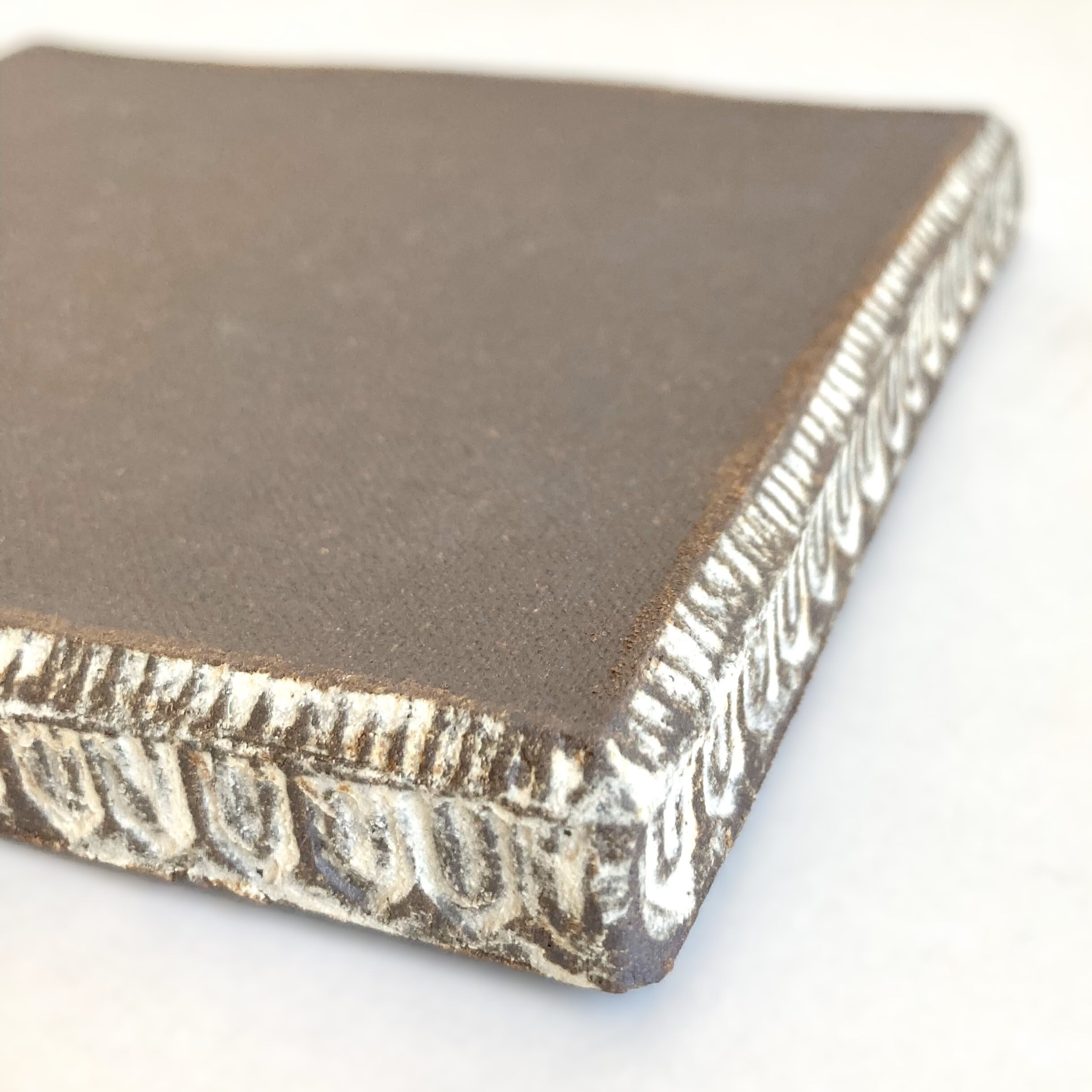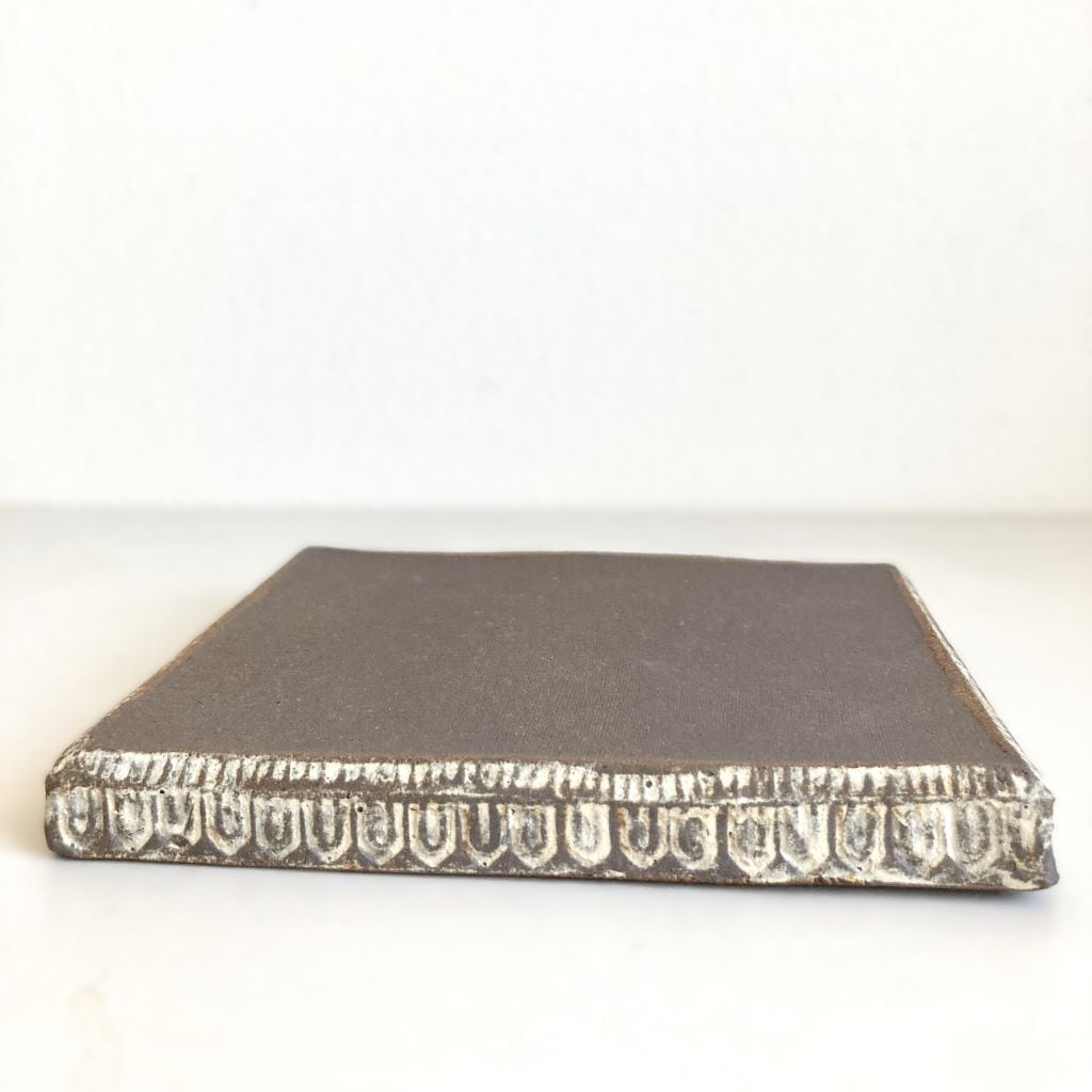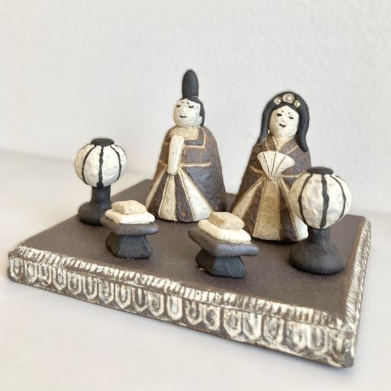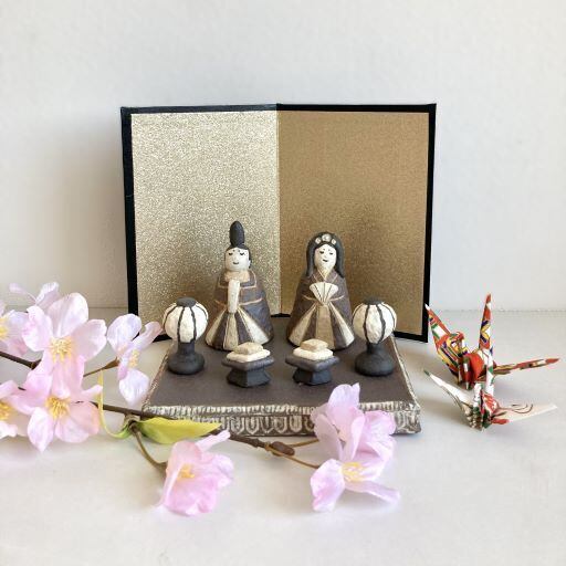 陶器の土台には、印花という手作りの素焼きのハンコを押し当てて模様をつけています。土台と模様の対照的な土の色の違いで、落ち着いた色調の中にも華やかさを表現しました。また、焼成時に煙で燻して炭化させているため、奥深い表情になっています。おひなさま以外にも、様々な用途でお使いいただけます。