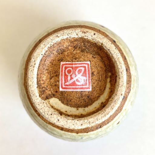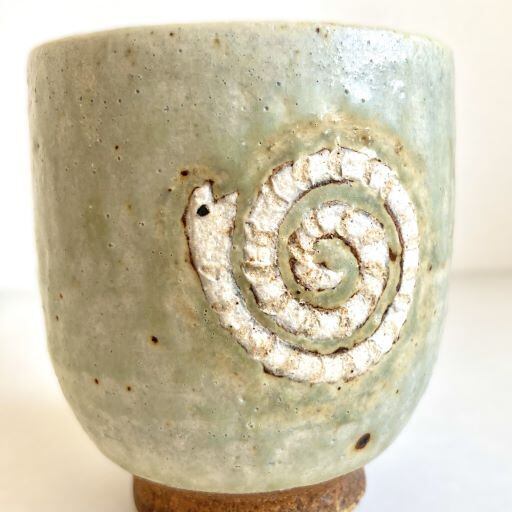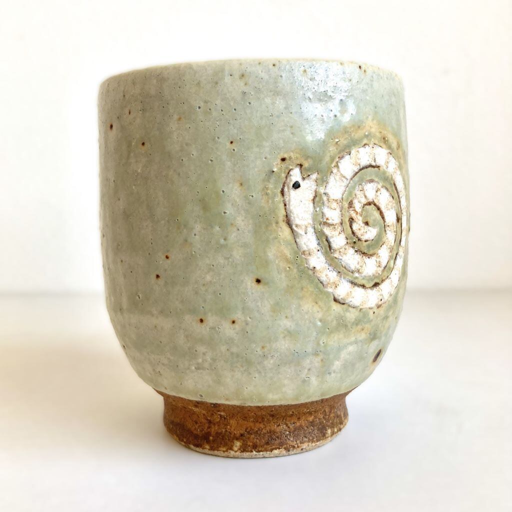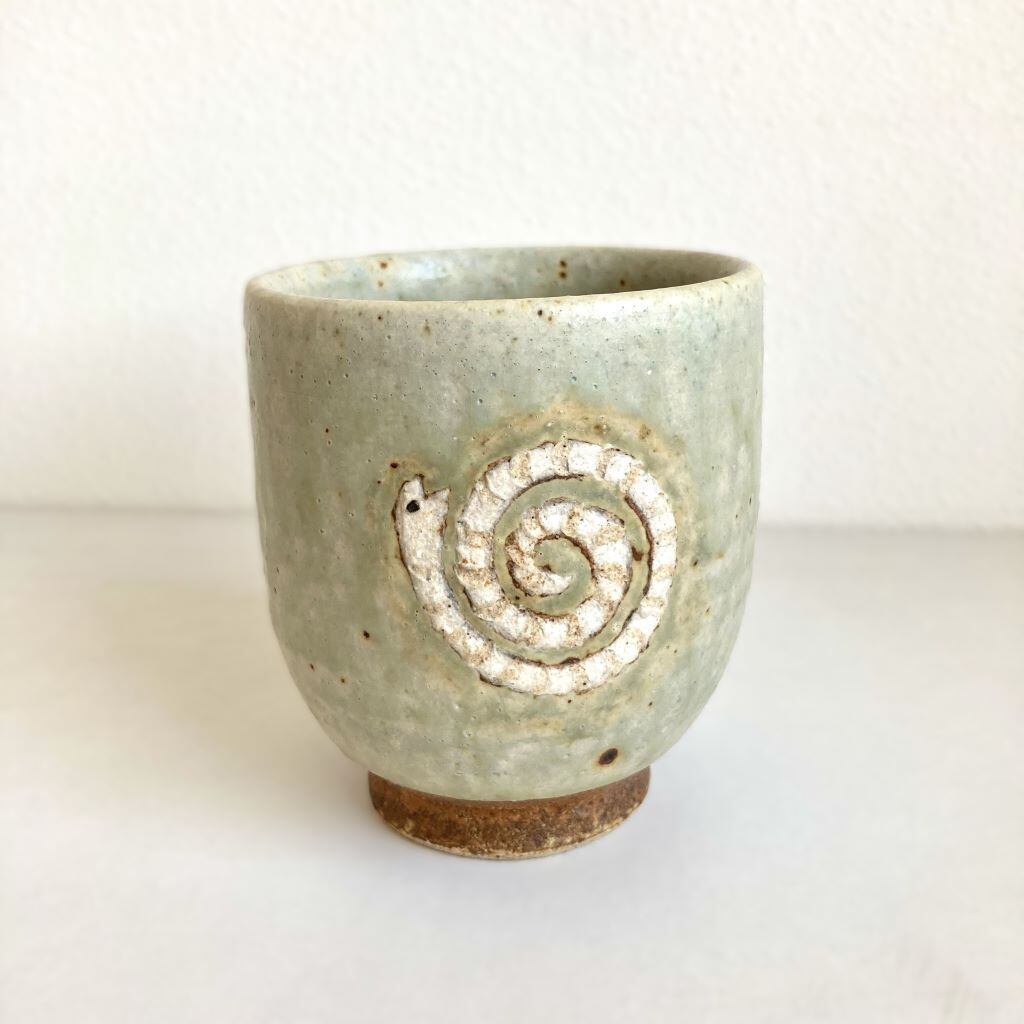 こちらは、愛らしいユニークなへびをモチーフにした陶器の湯呑です。表にはぐるぐると回っているかのような白いへびが施され、裏には巳の文字がデザインされています。